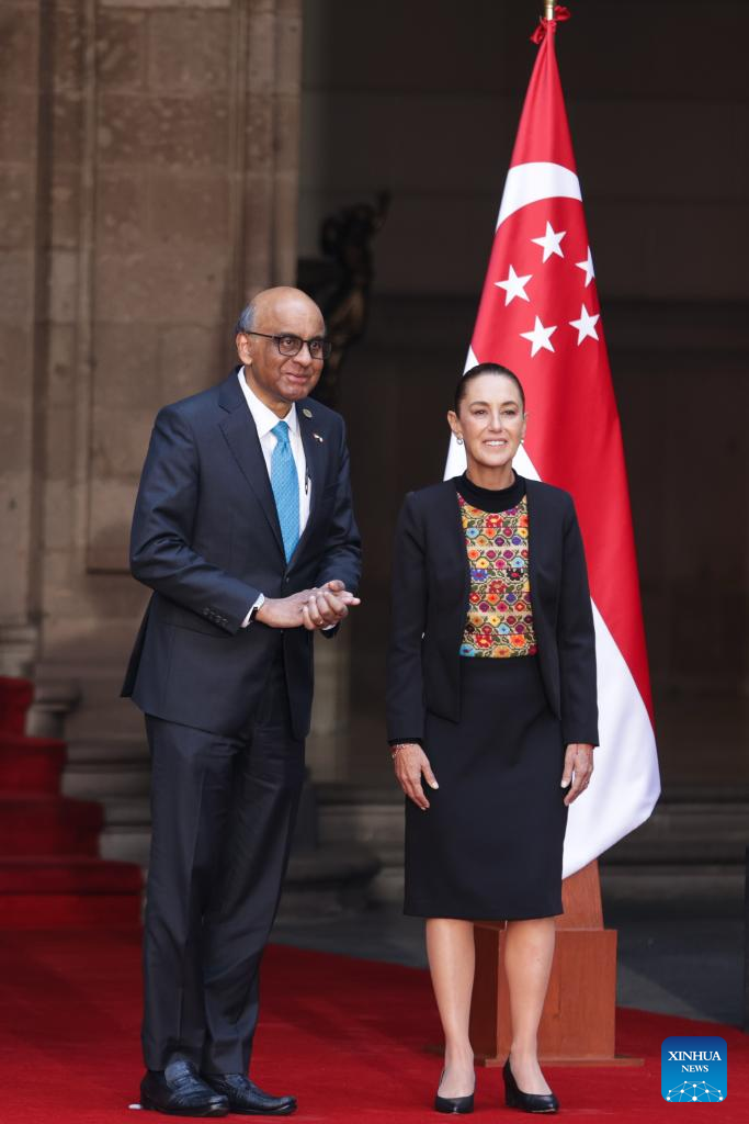 Mexican President Claudia Sheinbaum (R) hosts a welcome ceremony for visiting Singaporean President Tharman Shanmugaratnam (C) at the National Palace in Mexico City, Mexico, on Dec. 1, 2025. (Photo by Francisco Canedo/Xinhua)