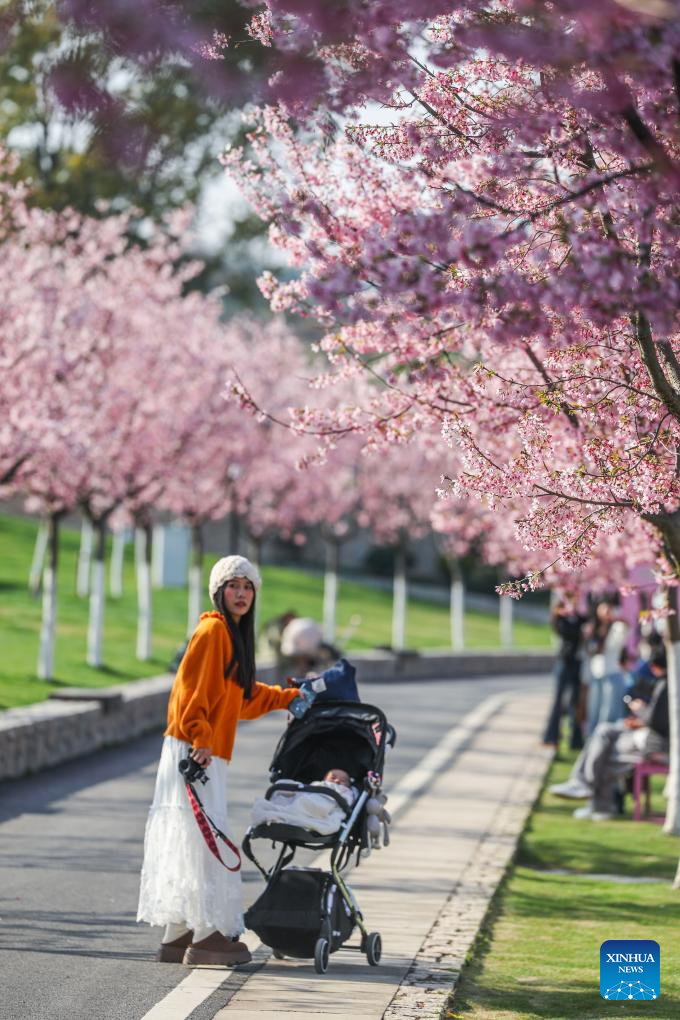 Tourists view cherry blossoms at a scenic area in Jinhua City, east China's Zhejiang Province, March 10, 2026. (Xinhua/Xu Yu)