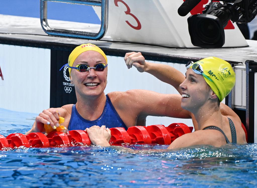 Emma Mckeon (R) of Australia reacts after the women's 50m freestyle final of swimming at the Tokyo 2020 Olympic Games in Tokyo, Japan, Aug. 1, 2021. (Xinhua/Wang Jingqiang)