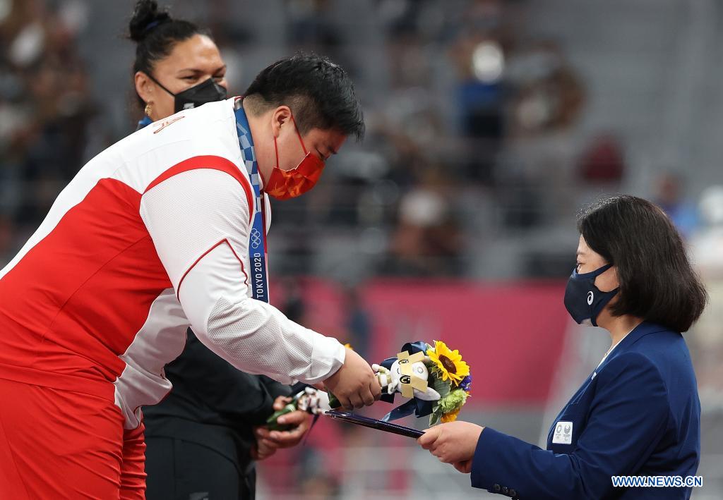 Gong Lijiao of China reacts during the awarding ceremony of the Women's Shot Put at the Tokyo 2020 Olympic Games in Tokyo, Japan, Aug. 1, 2021. (Xinhua/Wang Lili)