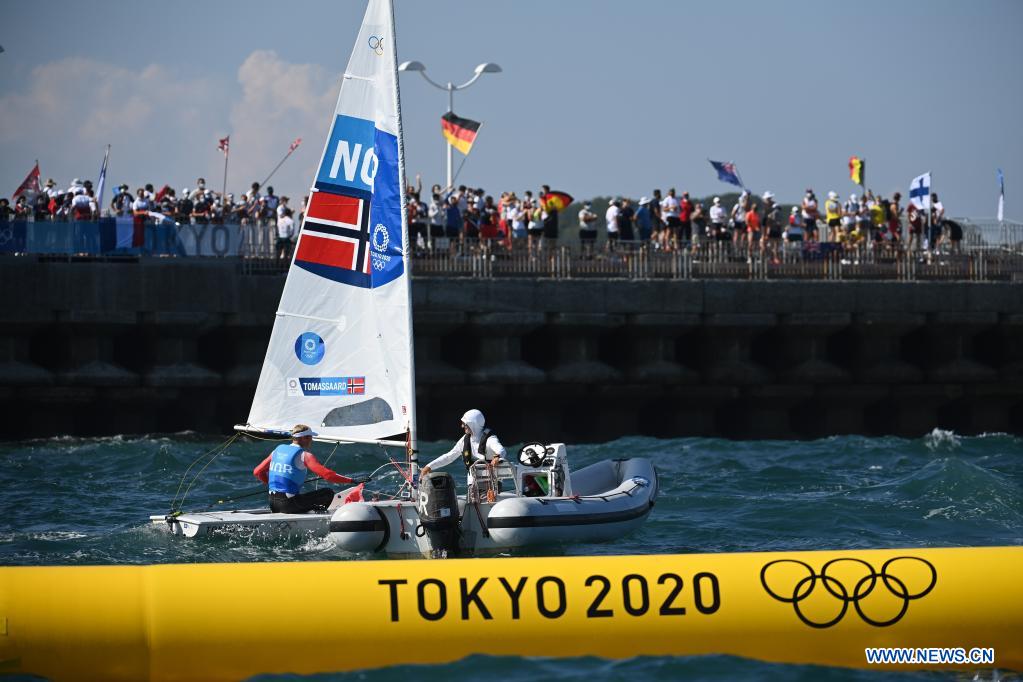 Hermann Tomasgaard of Norway is seen after the sailing men's one person dinghy laser medal race at the Tokyo 2020 Olympic Games in Kanagawa, Japan, Aug. 1, 2021. (Xinhua/Huang Zongzhi)