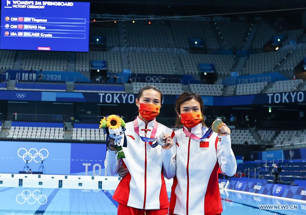 Wang Han (L), Shi Tingmao of China react after the awarding ceremony for the women's 3m springboard final of diving at Tokyo 2020 Olympic Games in Tokyo, Japan, Aug. 1, 2021. (Xinhua/Wang Jingqiang)