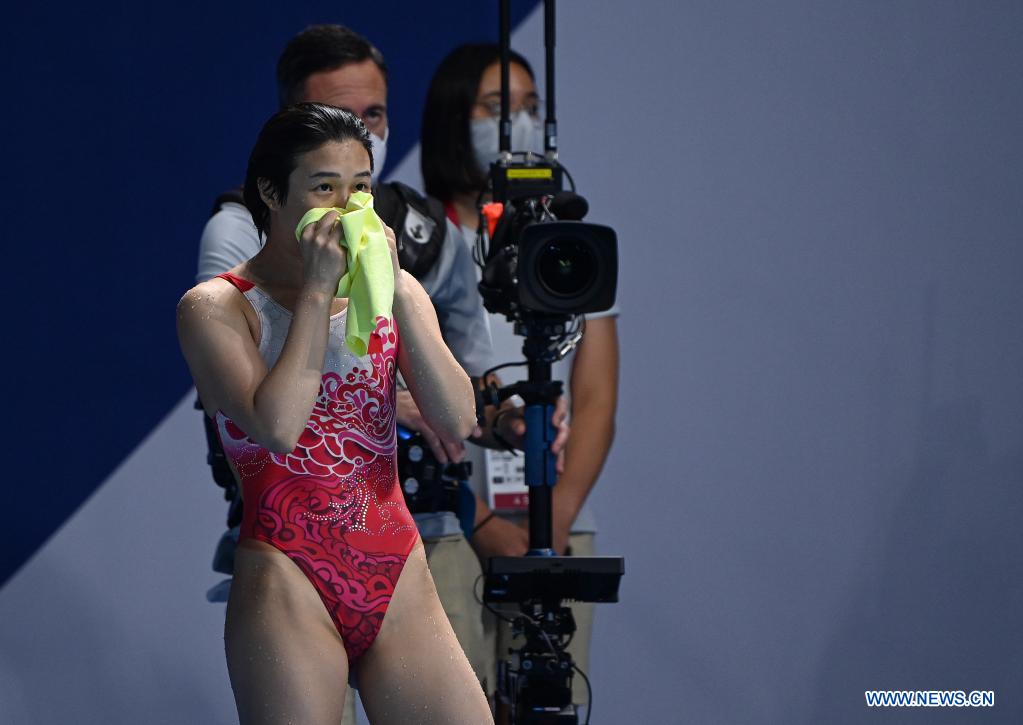 Shi Tingmao of China reacts during the women's 3m springboard final of diving at Tokyo 2020 Olympic Games in Tokyo, Japan, Aug. 1, 2021. (Xinhua/Wang Jingqiang)