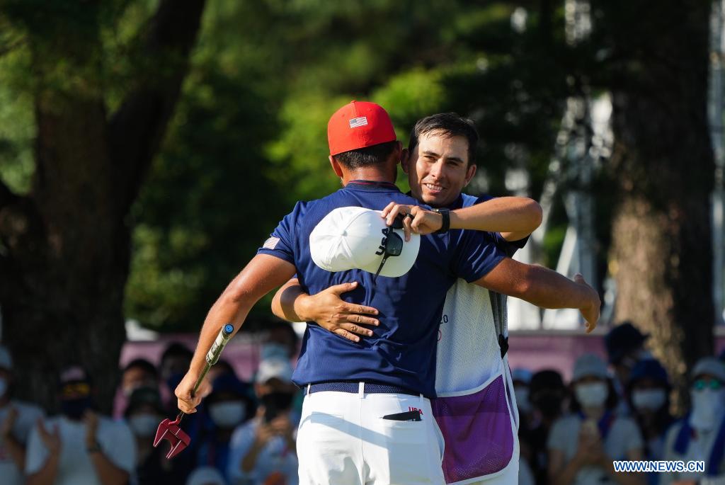 Xander Schauffele (R) of the United States celebrates winning after the men's individual stroke play round 4 golf match at Tokyo 2020 Olympics in Saitama, Japan, Aug. 1, 2021. (Xinhua/Liu Dawei)