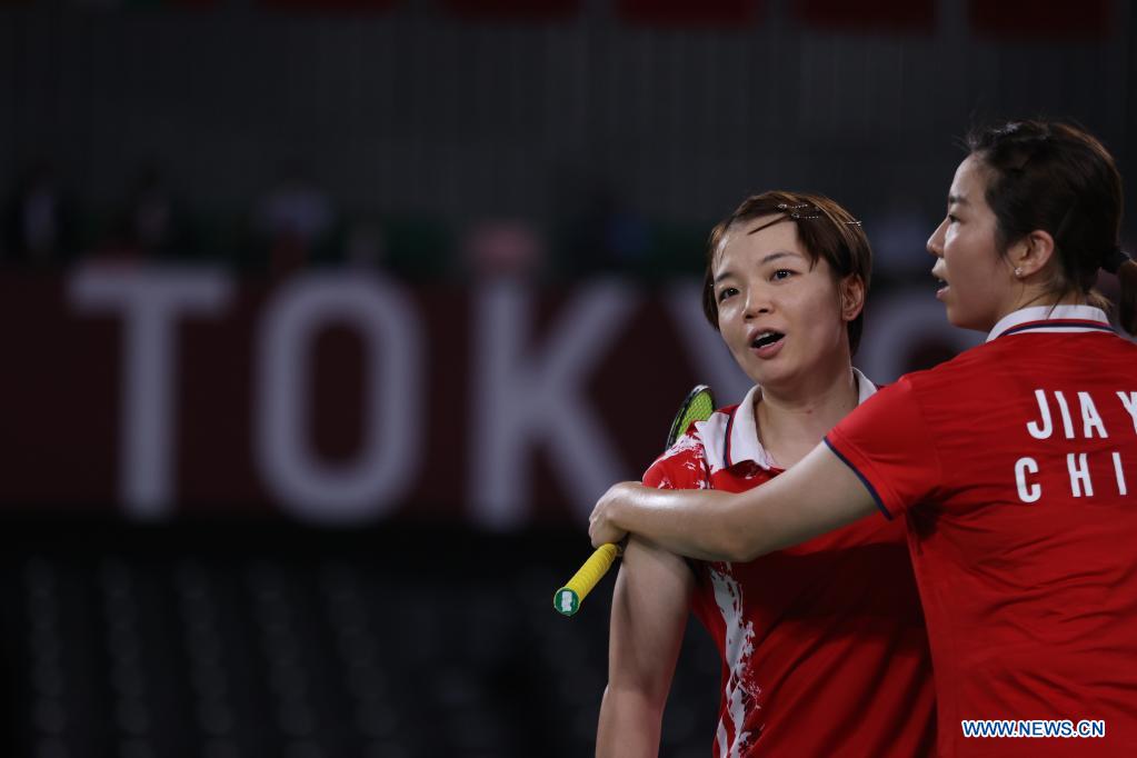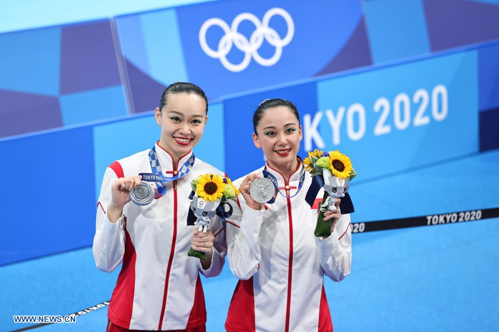 Wang Han (R), Shi Tingmao of China react after the awarding ceremony for the women's 3m springboard final of diving at Tokyo 2020 Olympic Games in Tokyo, Japan, Aug. 1, 2021. (Xinhua/Wang Jingqiang)