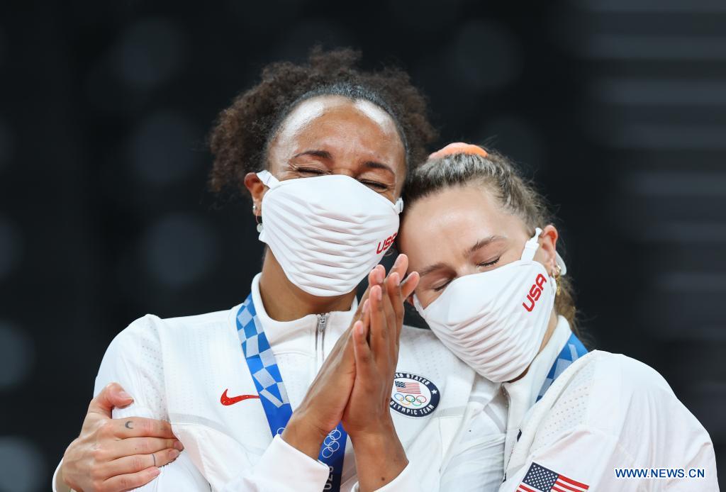 Gold medalist Gong Lijiao (C) of China, silver medalist Raven Saunders (L) of the United States and bronze medalist Valerie Adams of New Zealand react during the awarding ceremony of the Women's Shot Put at the Tokyo 2020 Olympic Games in Tokyo, Japan, Aug. 1, 2021. (Xinhua/Ju Huanzong)