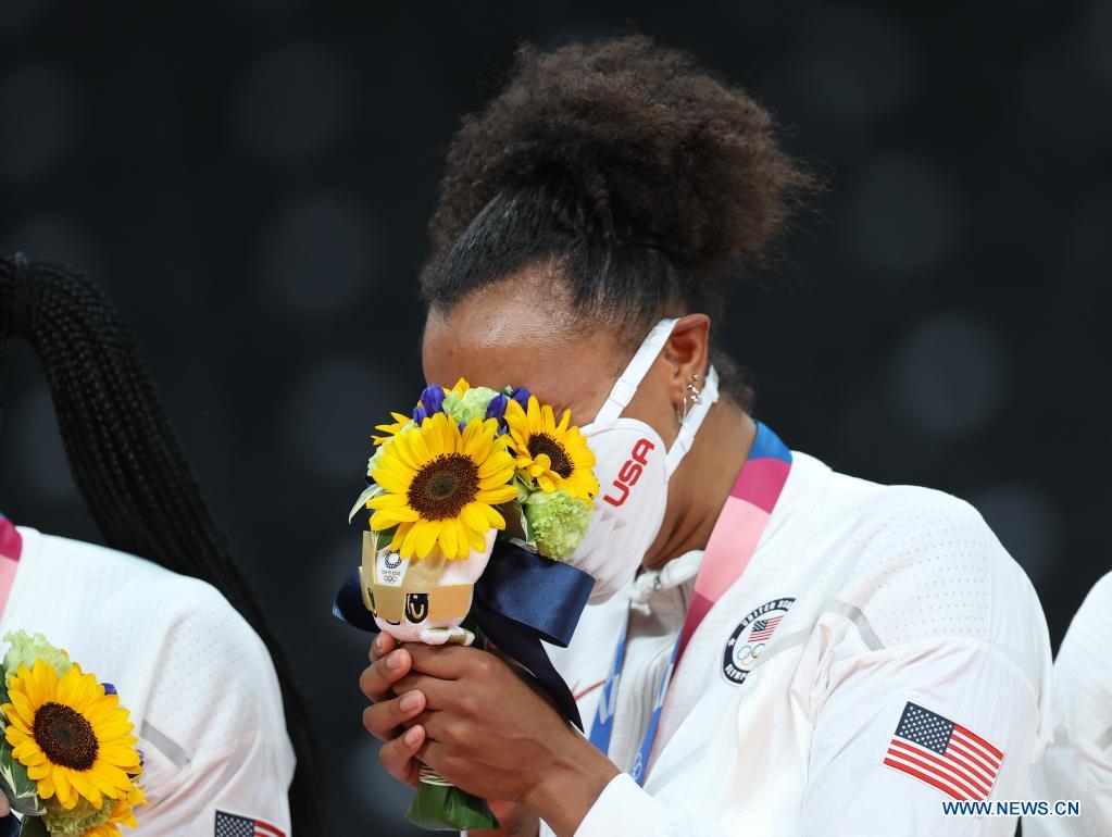 Photo taken on Aug. 1, 2021 shows the awarding ceremony for the women's 3m springboard final of diving at Tokyo 2020 Olympic Games in Tokyo, Japan. (Xinhua/Wang Jingqiang)