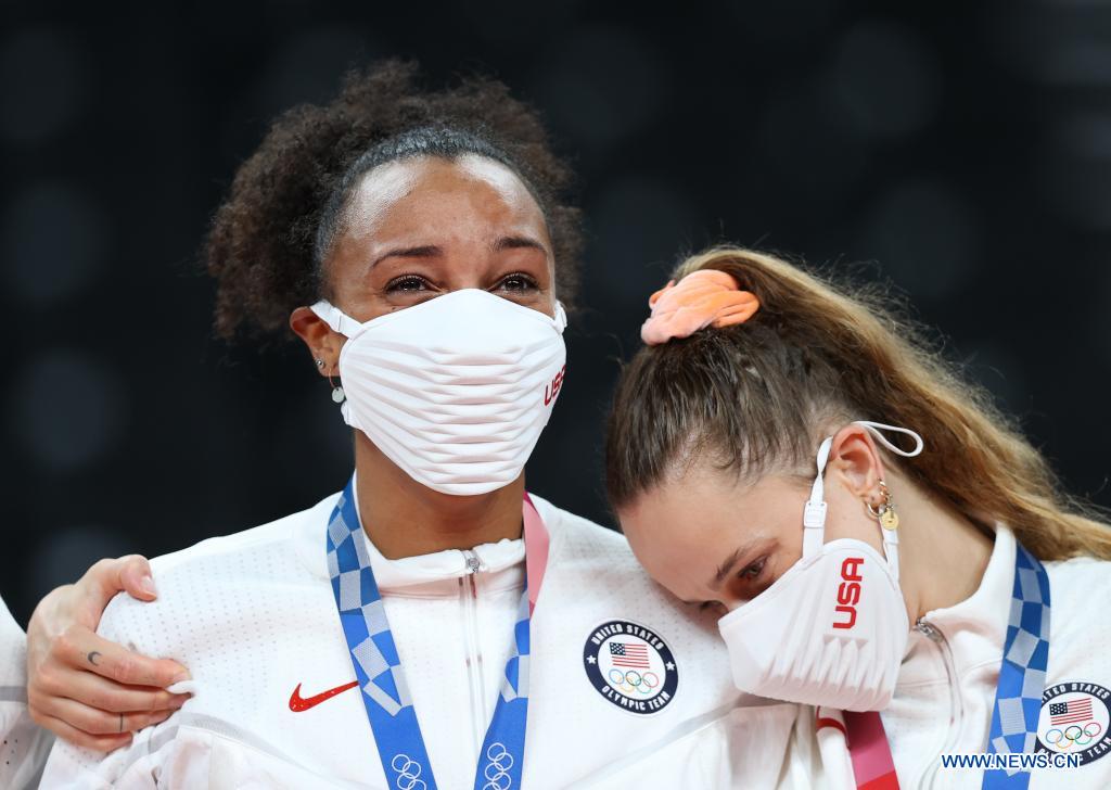Gold medalist Gong Lijiao (C) of China, silver medalist Raven Saunders (L) of the United States and bronze medalist Valerie Adams of New Zealand react during the awarding ceremony of the Women's Shot Put at the Tokyo 2020 Olympic Games in Tokyo, Japan, Aug. 1, 2021. (Xinhua/Li Ming)