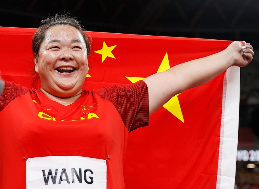 Gong Lijiao of China celebrates after winning the women's shot put final at Tokyo 2020 Olympic Games, in Tokyo, Japan, Aug 1, 2021. (Xinhua/Wang Lili)