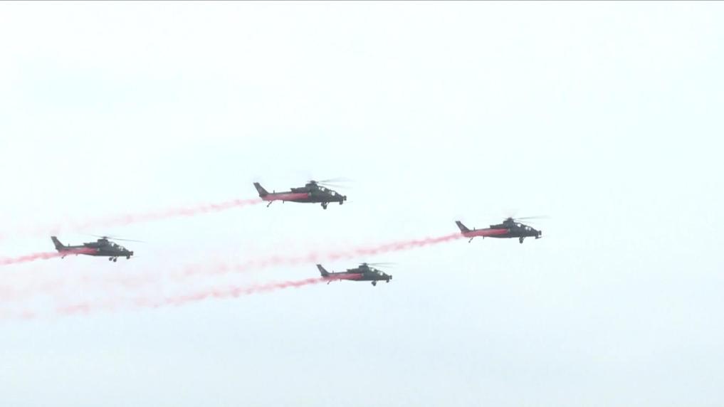 China's PLA aerobatic team performs during Tianjin helicopter expo