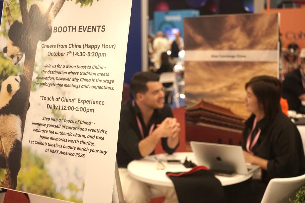 10月8日,在美国拉斯维加斯,人们在2025年美国国际会议与奖励旅游展的中国展区交谈。新华社发(曾慧摄)