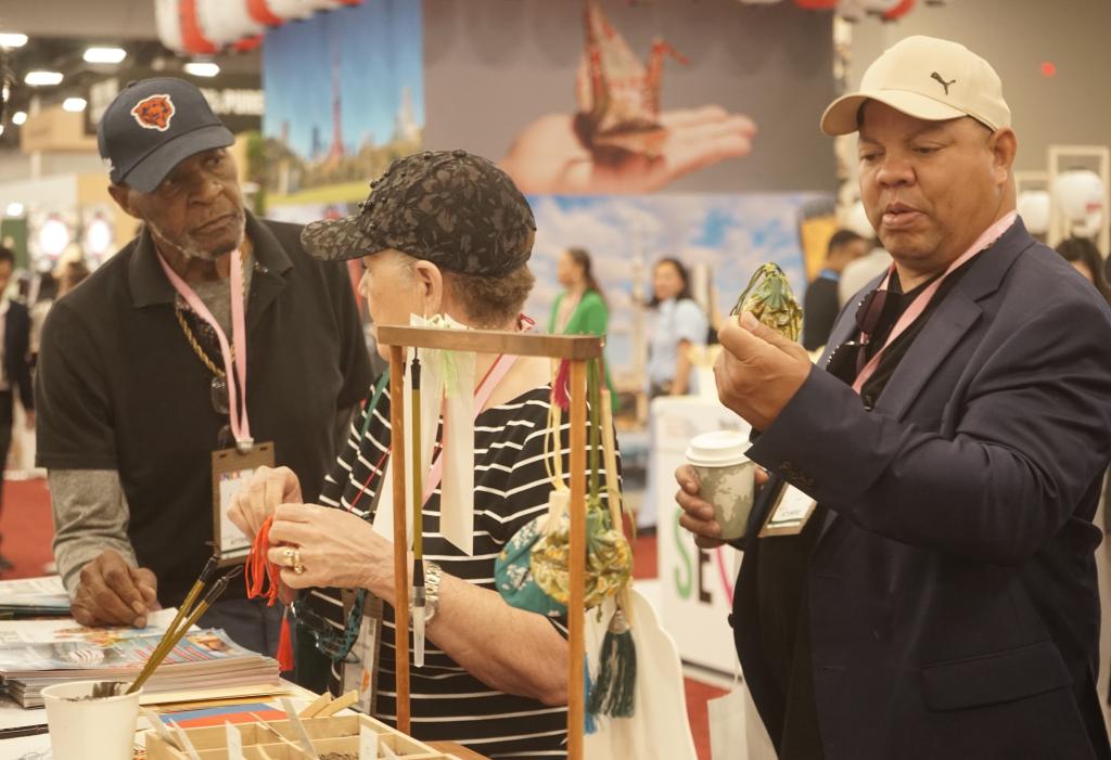 10月8日,在美国拉斯维加斯,参观者在2025年美国国际会议与奖励旅游展的中国展区倾听讲解。新华社发(曾慧摄)