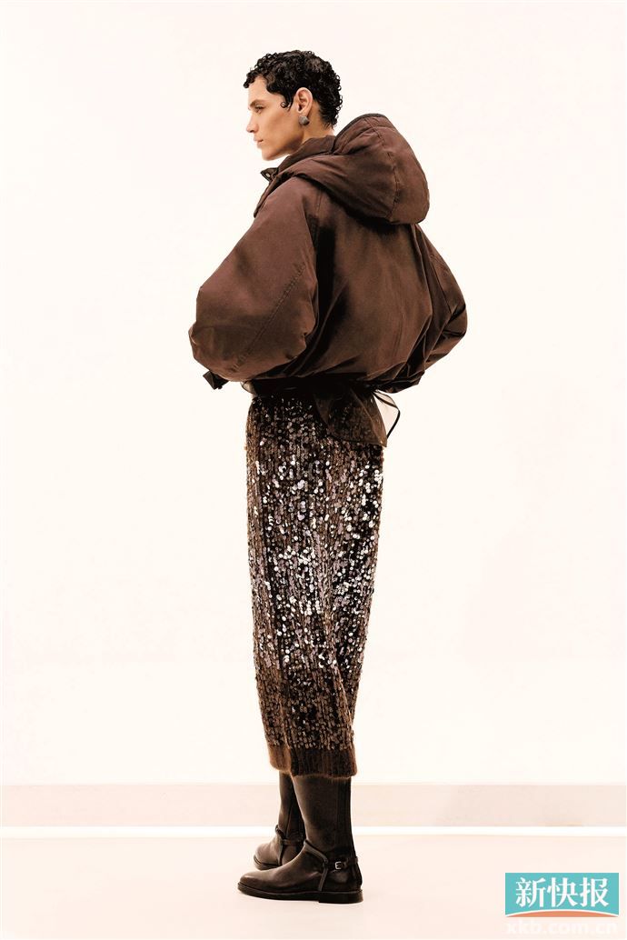 2025秋冬时尚语境中以棕色系、大地色系为主基调的穿搭持续流行,审美语言被注入新的光感交织与情绪感知,如加入浅灰蓝、鹅黄色等明亮的点缀与碰撞或是注入灵动亮色的内搭及配件、配饰,抑或是闪亮面料、亮面材质的搭配,如日光打在通透琥珀上折射出流光溢彩的美好瞬间……
