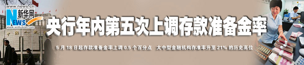 央行12日晚間宣布,從5月18日起,上調(diào)存款準(zhǔn)備金率0.5個百分點(diǎn)。這是央行年內(nèi)第五次上調(diào)存款準(zhǔn)備金率,也是去年以來第十一次上調(diào)。本次上調(diào)大約可鎖定商業(yè)銀行3700億元資金。 [詳細(xì)]