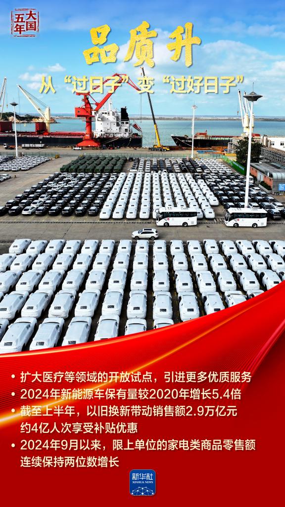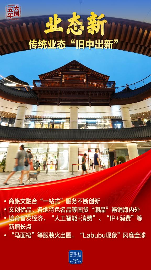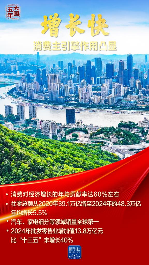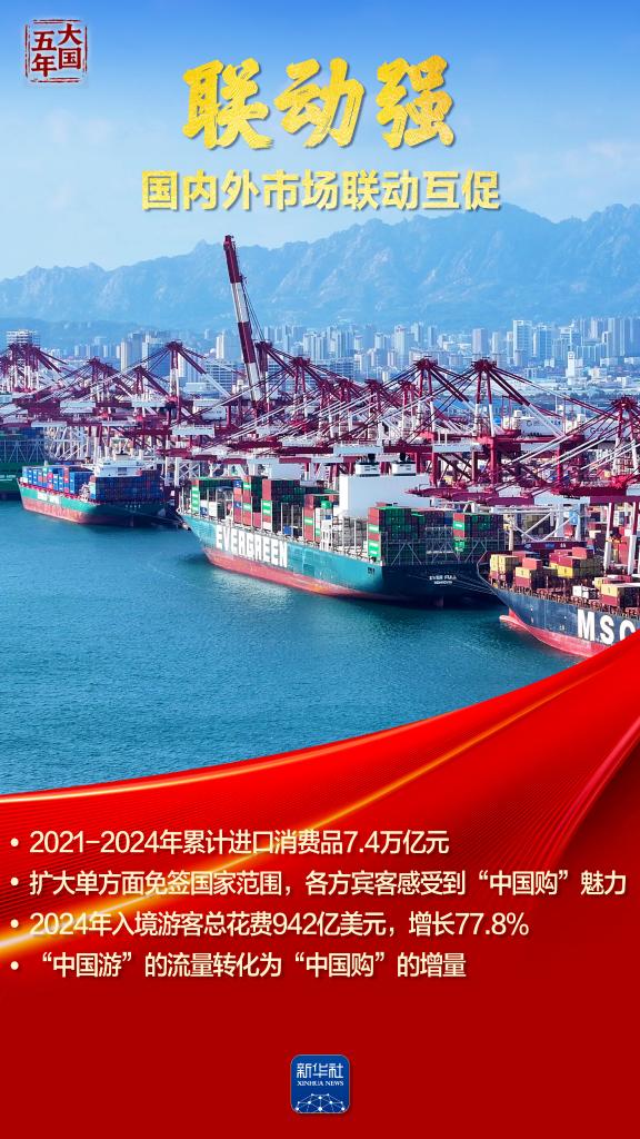 这五年,“智能”“绿色”焕新潮涌,国风文创、数字消费勾勒品质生活新图景;服务消费快速增长折射结构优化;“中国机遇”惠及世界,“中国市场”成为共享市场。跟随海报,共同见证超大规模市场蕴藏的磅礴底气,感受提振内需释放的澎湃动力。