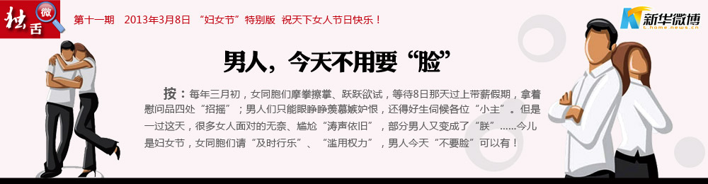 @蘄鄉(xiāng)農(nóng)夫: 在婦女節(jié)到來之時(shí),向長(zhǎng)期戰(zhàn)斗在試衣間,看韓劇,不做飯,魅力十足并掌握另一半錢包的杰出女性們致以節(jié)日的問候。祝所有美女們:三圍魔鬼化,收入白領(lǐng)化,家務(wù)甩手化,快樂日常化,愛情持久化,情調(diào)小資化,購(gòu)物瘋狂化,老公奴隸化,祝三八婦女節(jié)快樂!