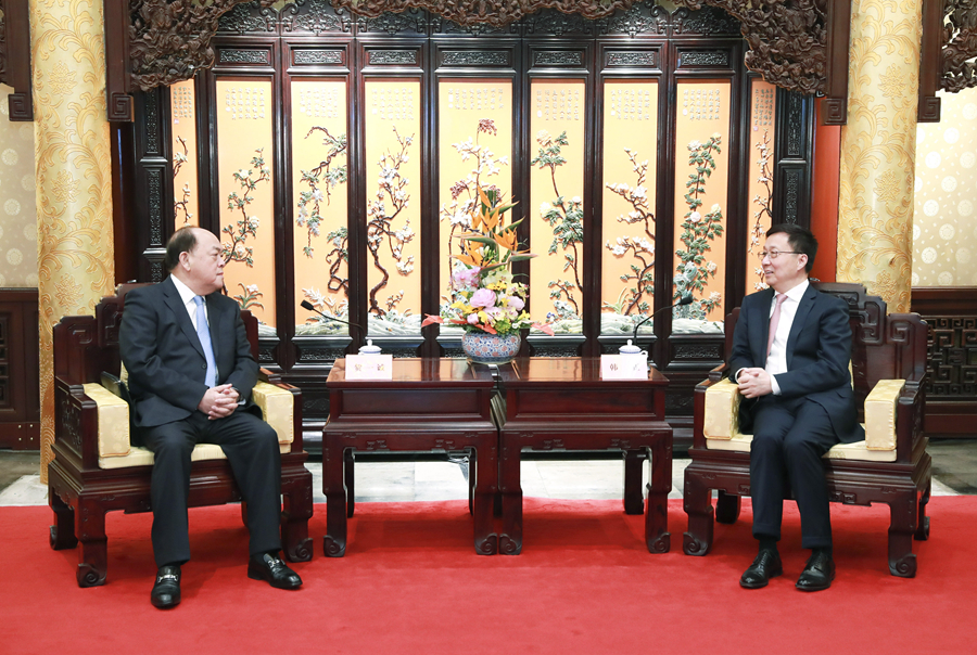 3月6日,中共中央政治局常委、國務院副總理韓正在北京釣魚臺國賓館會見澳門特別行政區行政長官賀一誠。新華社記者 龐興雷 攝