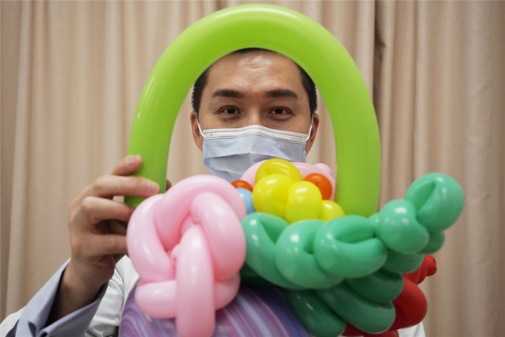 陳諾文是東區(qū)醫(yī)院的兒童及青少年科副顧問(wèn)醫(yī)生。之前,為了拉近與小患者的距離,陳諾文不時(shí)親手制作氣球卡通玩偶送給他們,因而練就純熟的氣球“手藝”,被小患者們親切地稱為“氣球大夫”。疫情暴發(fā)后,他總想看看有什么地方能幫得上忙,為抗疫加油。沒(méi)想到,氣球“手藝”就這樣派上了用場(chǎng)。