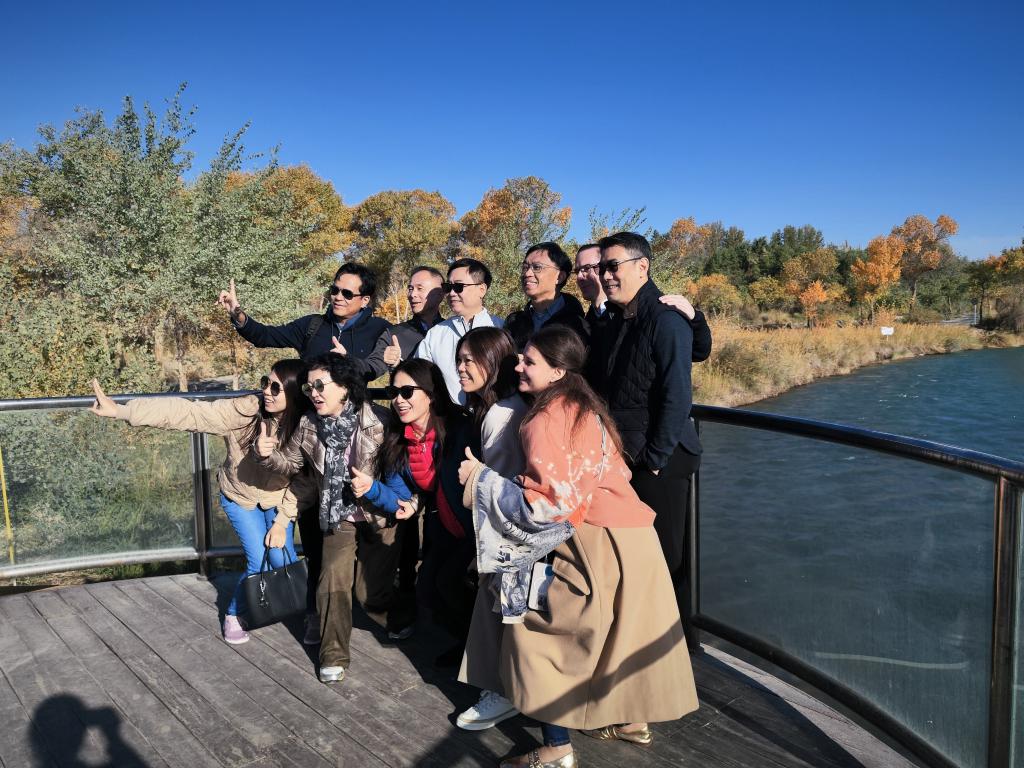 10月13日,外国驻港领团和商界代表团在新疆泽普县金湖杨国家森林公园合影留念。新华社记者 王昕怡 摄