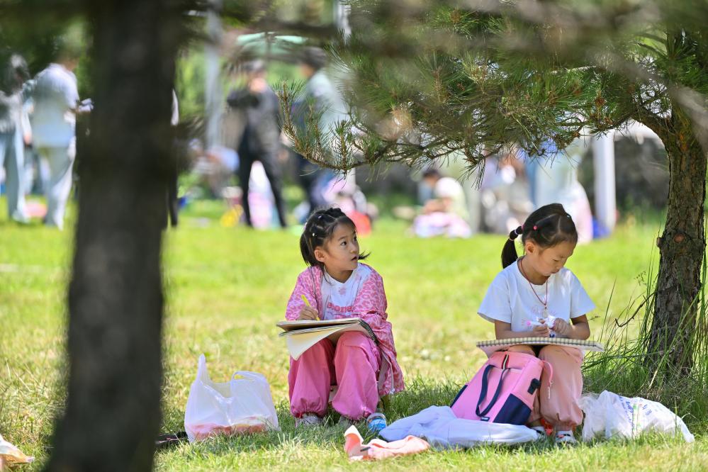 7月22日,两名小学生在大通县边麻沟花海景区内参加暑期美术写生研学活动。