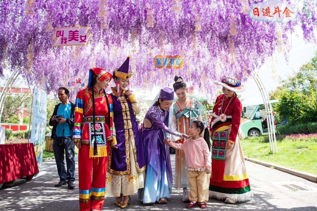 7月22日,在大通县边麻沟花海景区,工作人员与一名同家人来游玩的小朋友互动。