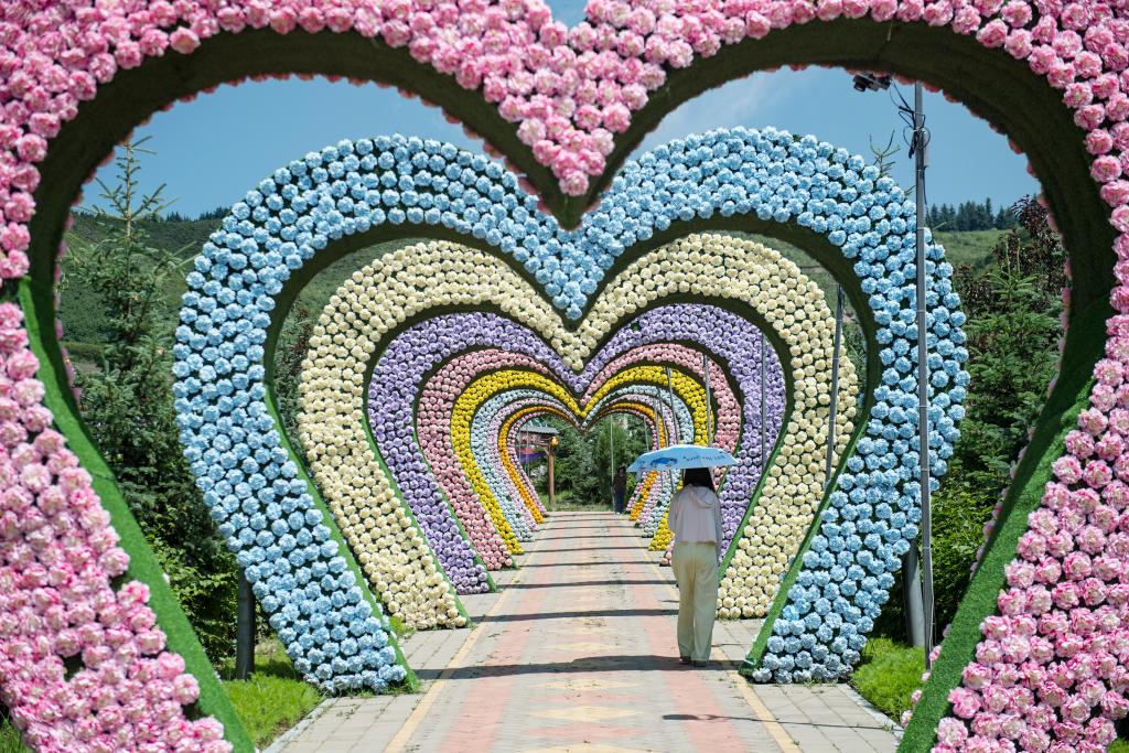 7月22日,在大通县边麻沟花海景区,一名游客经过鲜花长廊。