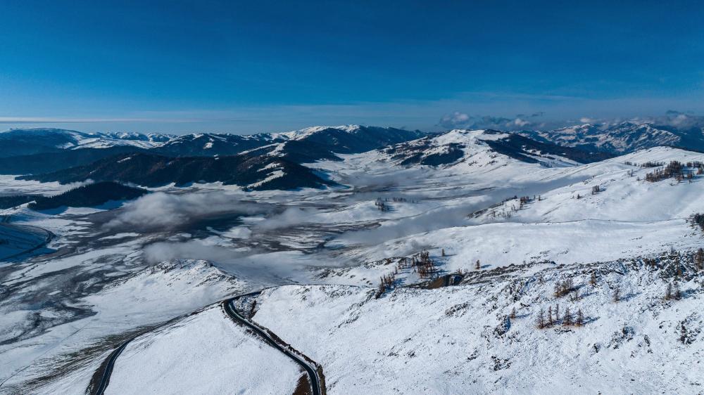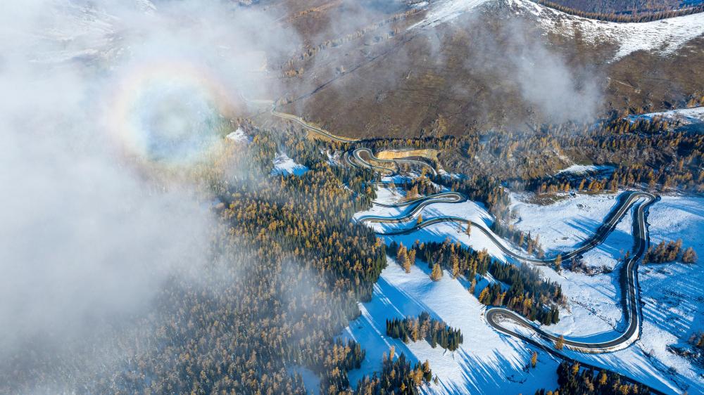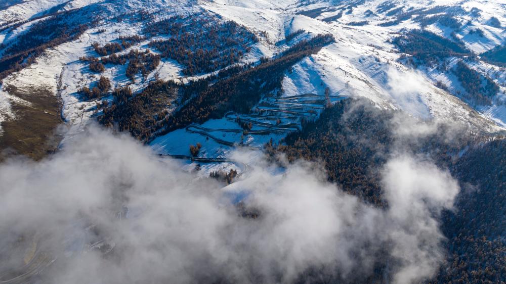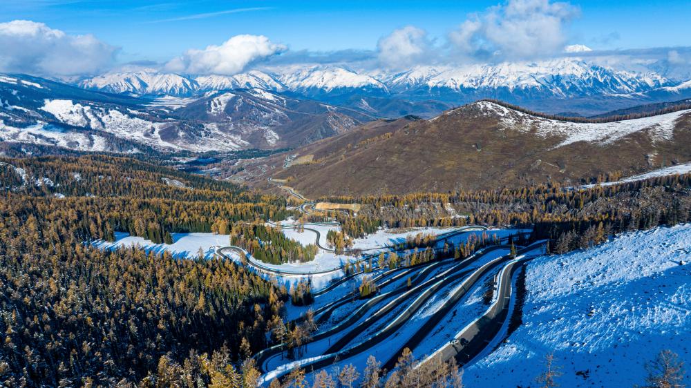 这是10月10日在阿尔泰山深处拍摄的阿禾公路(无人机照片)。