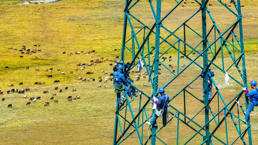 电力工人在阿禾公路配套35千伏输电线路铁塔上施工(10月2日摄,无人机照片)。