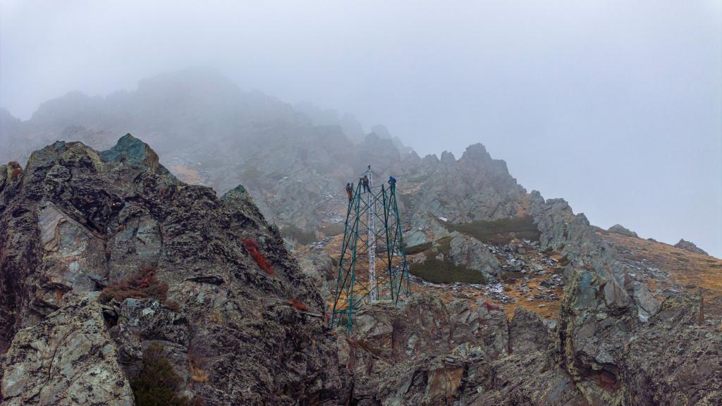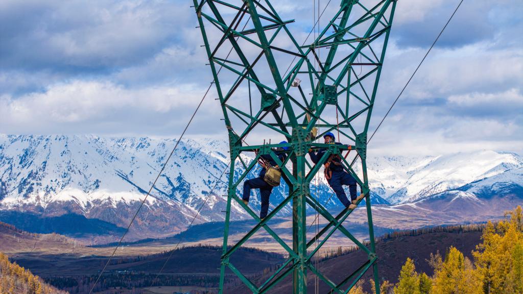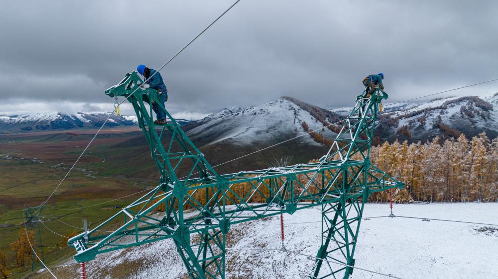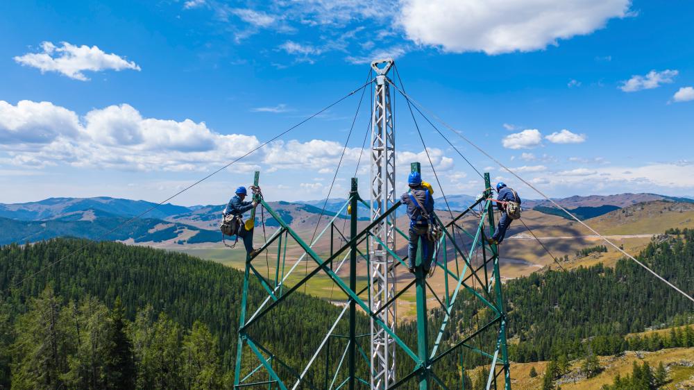 电力工人在阿尔泰山深处的铁塔上施工(9月3日摄,无人机照片)。工程建成投运后