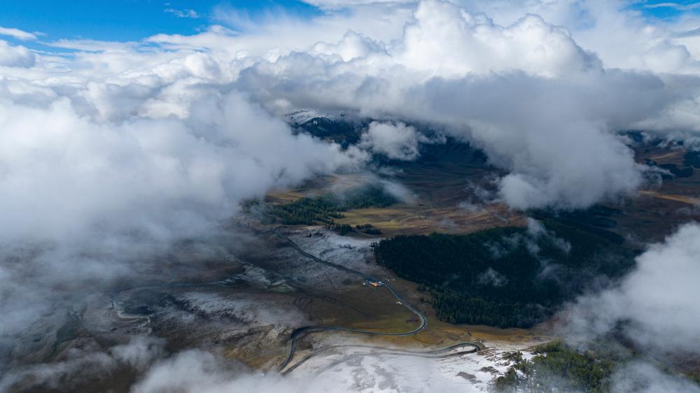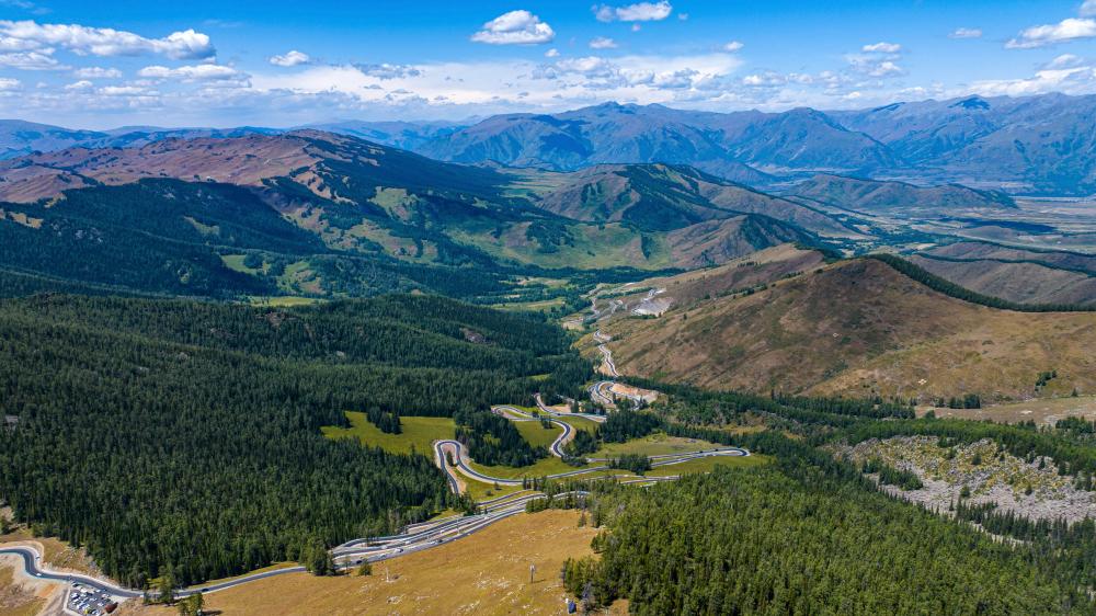 这是9月3日在阿尔泰山深处拍摄的阿禾公路(无人机照片)。