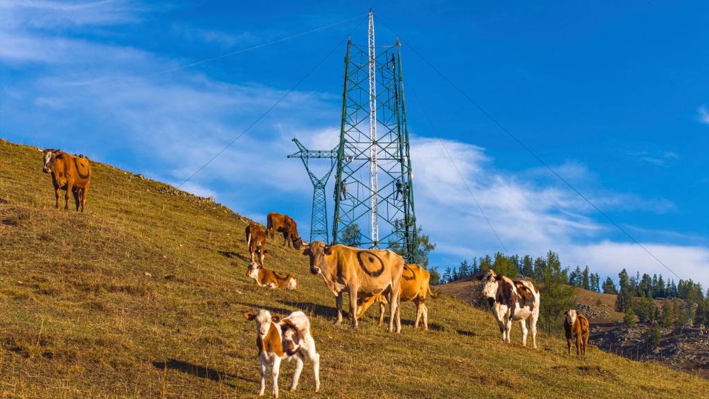 牛群从施工中的阿禾公路配套35千伏输电线路工程旁经过(8月22日摄)。