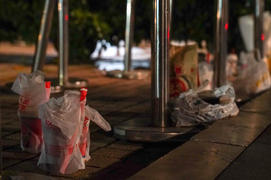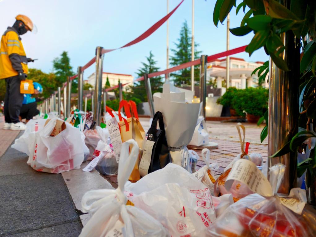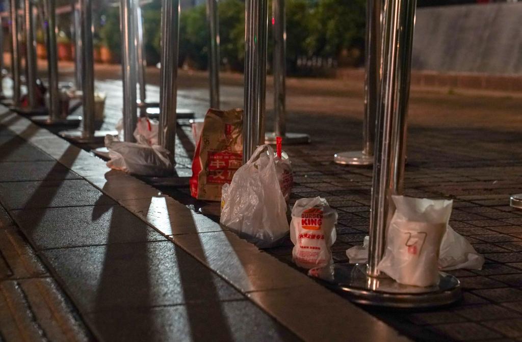 10月12日凌晨,在云南昆明某大学门口,外卖套餐中的部分小食、饮料被遗弃无人领取。