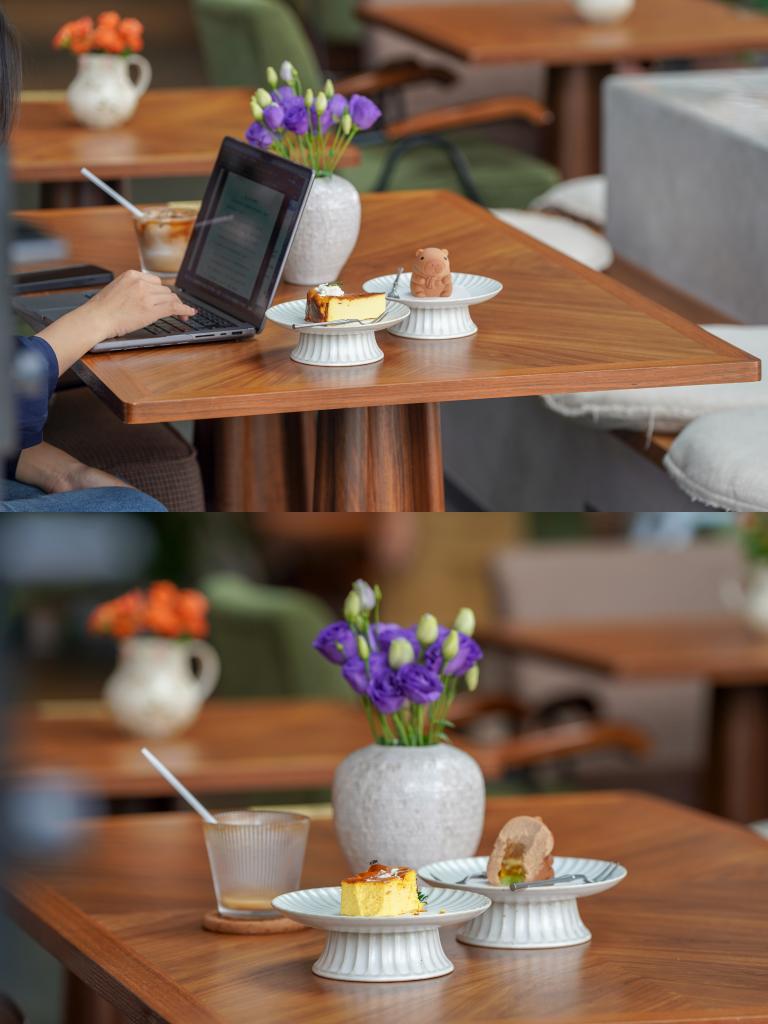 拼版照片:上图为10月11日,一位顾客在云南昆明某甜品店吃甜品;下图为仅吃了几口就被遗弃的蛋糕。
