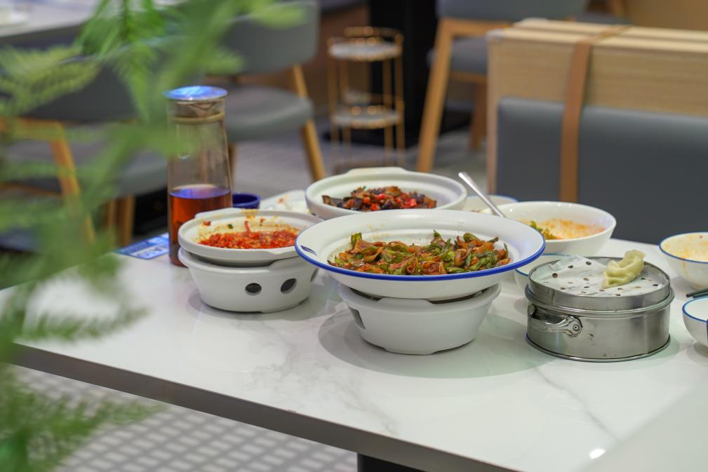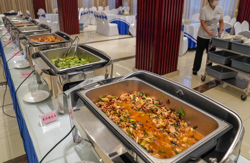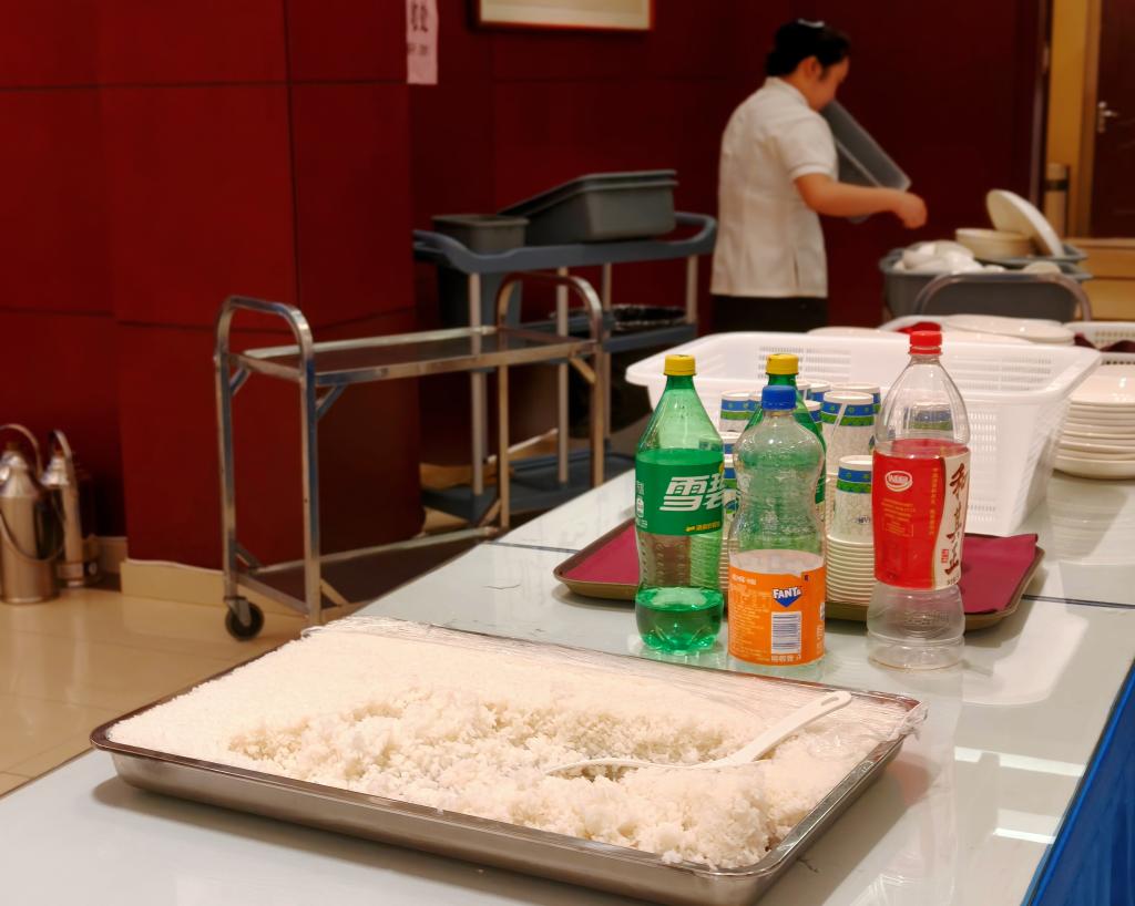 10月12日,在云南某市某食堂内,用餐人员已全部离去,只剩食堂工作人员在打扫卫生,但多个餐盘中仍剩余菜品、主食。
