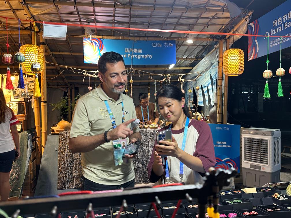 今年成都世界运动会期间,世运村为工作室设了竹编摊,不少外国运动员上手体验。击掌和拥抱不需要翻译,也不需要听力。