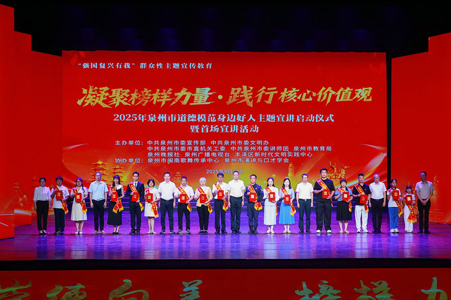 为弘扬崇高道德精神,着力培育时代新人,9月22日,2025年度泉州市“凝聚榜样力量·践行核心价值观”主题宣讲启动仪式暨首场宣讲活动在泉州市闽南歌舞传承中心举行,通过宣讲的形式,宣扬助人为乐、见义勇为、诚实守信、敬业奉献、孝老爱亲等道德典型的崇高精神,在全市形成学习、关爱、崇尚、争当先进典型的浓厚氛围。