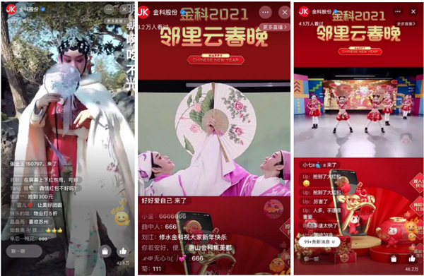 “金科2021鄰里云春晚”以“讓美好團(tuán)圓”為主題,為全國(guó)業(yè)主獻(xiàn)上了來自全國(guó)各地的特色歌舞、相聲、戲劇、武術(shù)等精彩節(jié)目。雖是一場(chǎng)沒有舞臺(tái)的晚會(huì),當(dāng)晚,5萬(wàn)余人共同在線觀看,直播點(diǎn)贊數(shù)超56萬(wàn)次。