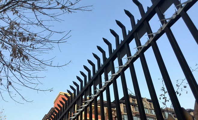 保安對小區進行24小時巡視,并配有防暴鋼叉等安防裝備。小區的圍墻柵欄設有金屬刺,具有較強的防攀爬功能。小區實現了嚴格的人車分流。