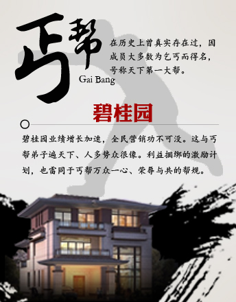 碧桂園 丐幫 丐幫因成員大多數(shù)為乞丐而得名,號稱天下第一大幫。 碧桂園是今年房企風(fēng)頭最勁的一匹黑馬。和丐幫人多勢眾一樣,全民營銷,其躋身千億軍團的最大功臣。