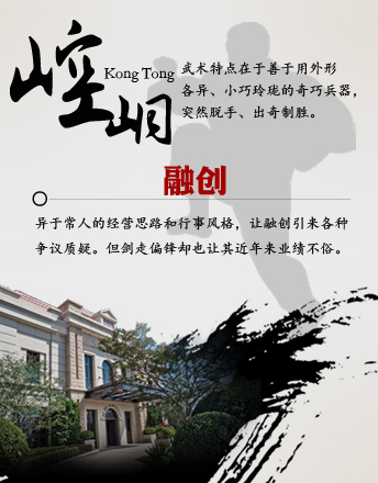 融創(chuàng) 崆峒派 崆峒武術(shù)特點在于奇兵,外形各異、攜帶方便, 往往暗藏于袖筒和靴筒中,交手中往往突然出擊取勝。今年頻頻拿地,其異于常人的經(jīng)營思路,讓孫宏斌招致各種爭議和質(zhì)疑。