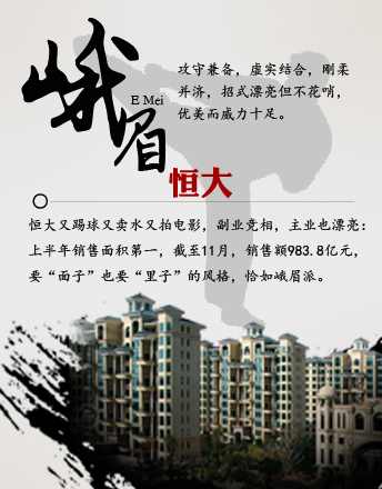 恒大 峨眉派 峨眉派攻守兼?zhèn)洌搶嵔Y(jié)合,剛?cè)岵惺狡恋换ㄉ凇? 恒大既搞副業(yè),又攻主業(yè),樣樣風(fēng)生水起。年度銷售額新入圍千億俱樂部。要面子也要里子的風(fēng)格,恰如峨眉派。