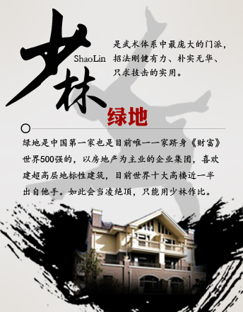 綠地 少林派 少林是體系最龐大的門派,招法剛健有力、攻防兼?zhèn)洹銓崯o華。 綠地是中國首家躋身《財富》世界500強的,以房產(chǎn)為主業(yè)的企業(yè)。項目遍及全國,世界十大高樓近一半來自綠地。