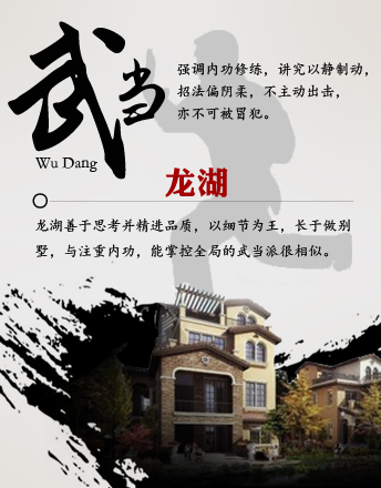 龍湖 武當(dāng)派 武當(dāng)強調(diào)內(nèi)功修練,以靜制動,一般不主動進攻,但亦不可輕易侵犯。 龍湖出手拿地都經(jīng)深思,經(jīng)營風(fēng)格沉穩(wěn)凌厲,重細(xì)節(jié)品質(zhì)。與注重內(nèi)功,看似被動實能縱觀全局的武當(dāng)派很像。