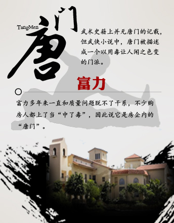 富力 唐門 唐門用毒之名,天下皆知。 富力擁有一級開發(fā)資質(zhì),卻總是遭業(yè)主維權(quán)。因壓縮成本、過快擴張導(dǎo)致的質(zhì)量問題一再曝光。讓購房人后悔不迭,因此說富力是房企內(nèi)的“唐門”。