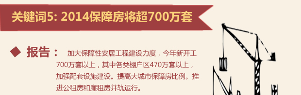 李克強(qiáng)總理在報(bào)告中指出,2014年要加大保障性安居工程建設(shè)力度,今年新開工700萬套以上,其中各類棚戶區(qū)470萬套以上;提高大城市保障房比例,推進(jìn)公租房和廉租房并軌運(yùn)行,年內(nèi)基本建成保障房480萬套……