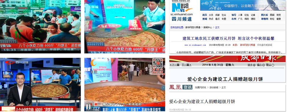 11:30許,在仁恒濱河灣建筑工地活動板房前,諾大的月餅已經擺放在農民工兄弟代表面前?!拔以缇吐犝f你們要來給我們送月餅,但是沒想到這個月餅居然這么大!”來自廣西的小姚不禁感嘆道。據記者了解,小姚雖然今年只有29歲,但是已經做建筑工人快10年了。2011年帶女兒一起來到成都,足足已有三年沒有和家人一起過中秋節了。