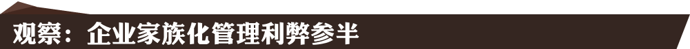 然而,在外界看來,“家族化”管理和“去家族化”管理各有利弊。國泰君安分析師余立峰在接受新華網的采訪時表示,“家族化”管理在企業發展初期還是有一定的優勢,因為規模比較小,區域化較強,管理權制也相對集中,這樣有利于公司整體的規模和銷售的擴大。隨著企業的發展到了一定程度以后,也就是到了全國化布局的時候,需要區域上的分制,使總部和區域管理出現分制。