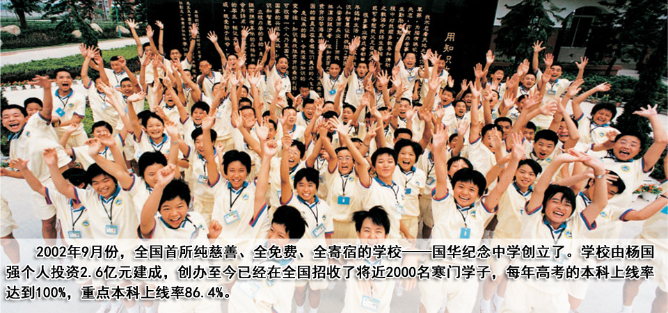 在楊國華去世10多年以后,楊國強計劃,以大哥的名字成立一所學校,一所只招收中國最貧困、最優秀學生的全日制慈善高中——國華紀念中學,以此來紀念英年早逝的大哥。