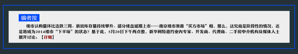 ???? 樓市認購量環(huán)比連跌三周、新房庫存量持續(xù)攀升、部分樓盤延期上市……南京樓市漸露“買方市場”相,那么,這究竟是階段性的情況?還是將成為2014樓市“下半場”的狀態(tài)?基于此,5月20日下午兩點整,新華網(wǎng)特邀約業(yè)內(nèi)專家、開發(fā)商、代理商、二手房中介機構(gòu)及媒體人士展開討論。