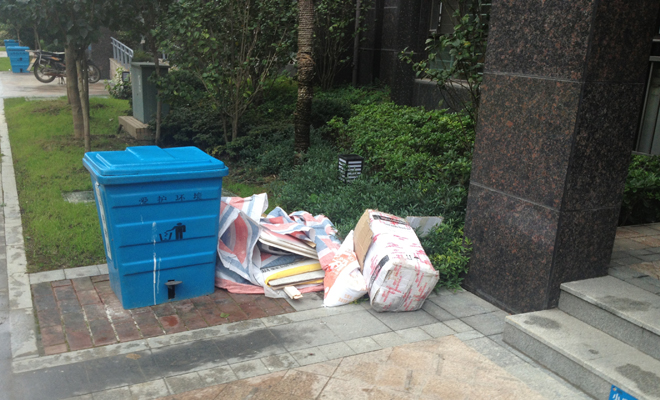 在中糧彩云居側門口,雖然有刷卡進入的標識,但卻沒有安排實際的保安值班。此外,一些業主還反映物業有時候垃圾清理不是很及時。在小區內部,記者的確看到許多垃圾被隨意丟棄在垃圾桶外側無人管理,同時,小區內垃圾也沒有明顯的分類標志。